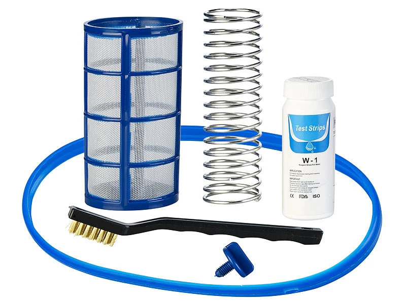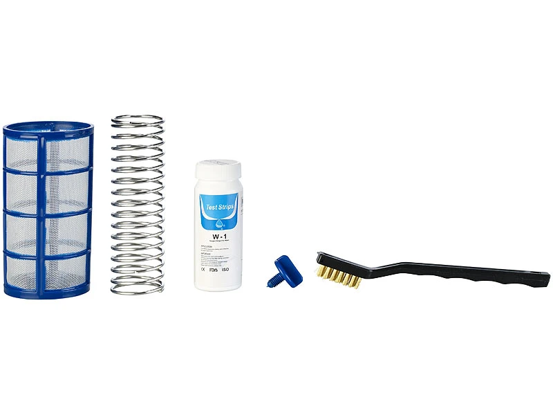- Ersatzteile-Set inklusive Filter, Filterschraube, Edelstahl-Springfeder, Gummidichtung, Drahtbürste, 30 Teststreifen und deutscher Anleitung
