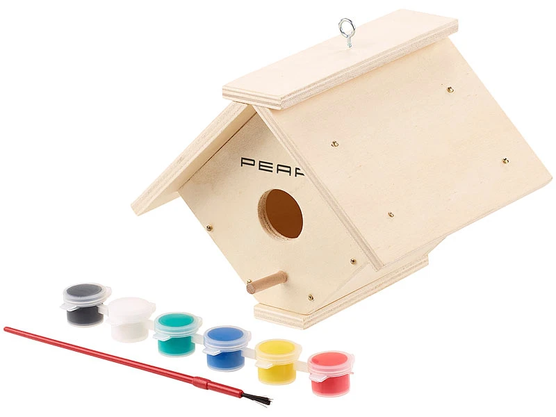 - 9-teiliger Vogelhaus-Bausatz inklusive 6 Farben, Pinsel, Nägeln, Leim, Aufhänge-Haken und deutscher Anleitung – Vogelhäuser – Außerdem relevant oder passend zu: Nist, Eier, Malen, Farbe, Vogel, Basteln, Frühling, Baukasten, Geschenke, Spielzeug, Futterhaus, Geschenkidee, vogelhauschen, Kinder Garten, Geschenkideen