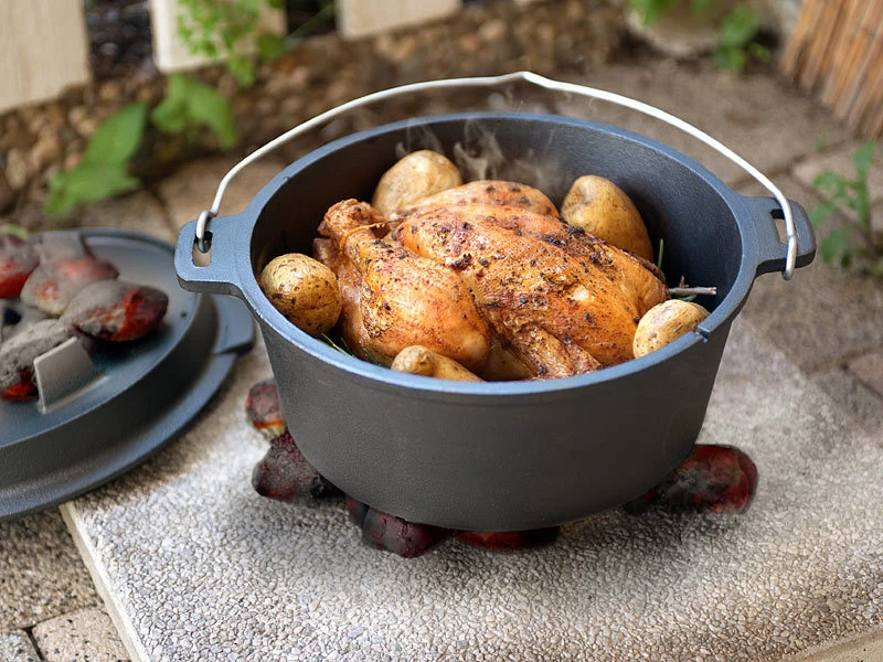 Ihre flexible Kochgelegenheit zum Mitnehmen: Ob kochen, dünsten, braten, schmoren, backen – mit Ihrem Dutch Oven gelingt Ihnen das kinderleicht und überall. Stellen Sie ihn einfach mit seinen Standfüßen in Lagerfeuer, Feuerstellen, Öfen u.v.m. Und für Ober- und Unterhitze legen Sie einfach zusätzlich glühende Kohlen oder Glut auf den Deckel.