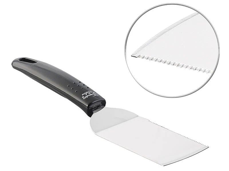 - Leichte Aufnahme des Grillguts dank angeschliffener Kante