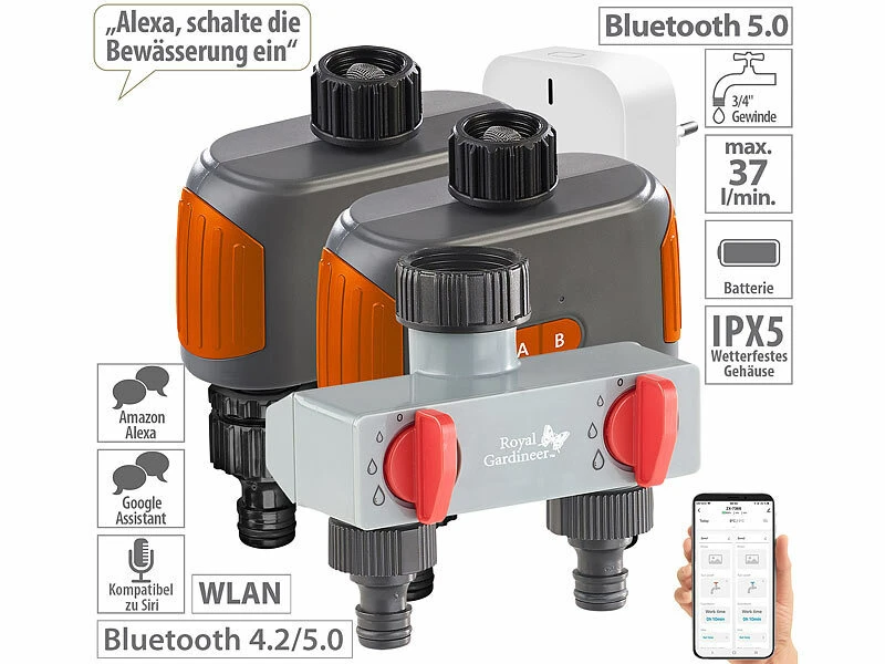 - Bewässerungscomputer BWC-600.bt inklusive 2 Klickanschluss-Adaptern, 2-fach-Wasserverteiler, 2 Schlauch-Schnell-Kupplungen, Wasserhahn-Verbinder, WLAN-Gateway, 2 Rollen Abdichtband und deutscher Anleitung