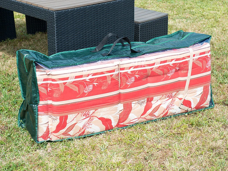 Bietet besten Schutz vor Regen, Schnee und Schmutz: Die wetterfeste und extrem widerstandsfähige Schutztasche aus Polyethylen-Gewebe bewahrt Ihre Outdoor-Sitz- und Liegekissen sicher vor Umwelteinflüssen. So sieht Ihr Garten-Set auch nach dem Winter noch aus wie neu.
