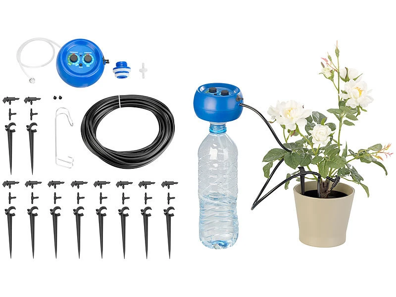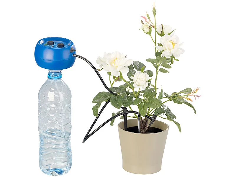 Bis zu 10 Pflanzen bestens versorgt: Befestigen Sie die Bewässerungs-Anlage einfach an einem gefüllten Wassereimer oder auf einer Wasserflasche. Ihre Pflanzen vernetzen Sie per Schlauch-System. Und schon versorgt die Wasserpumpe Ihre Zimmerpflanzen – vollkommen automatisch!