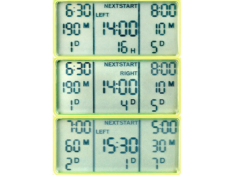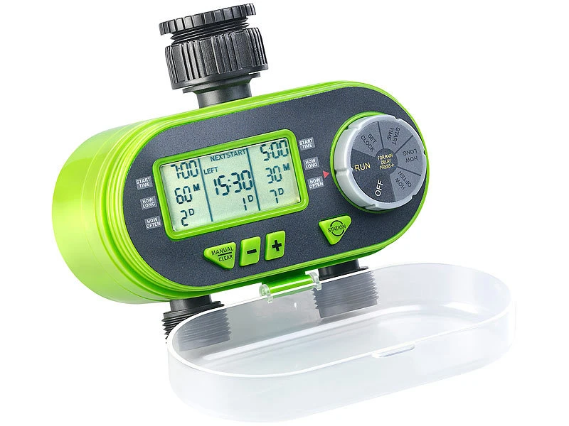 Die Bedienung ist kinderleicht: Sie steuern Bewässerungszeiten und -intervalle vollkommen flexibel. Wählen Sie Bewässerungszeiten von 5 Sekunden bis zu 6 Stunden und lassen Sie in Abständen von bis zu 7 Tagen gießen. Den aktuellen Bewässerungsstatus lesen Sie jederzeit auf dem übersichtlichen LCD-Display ab.