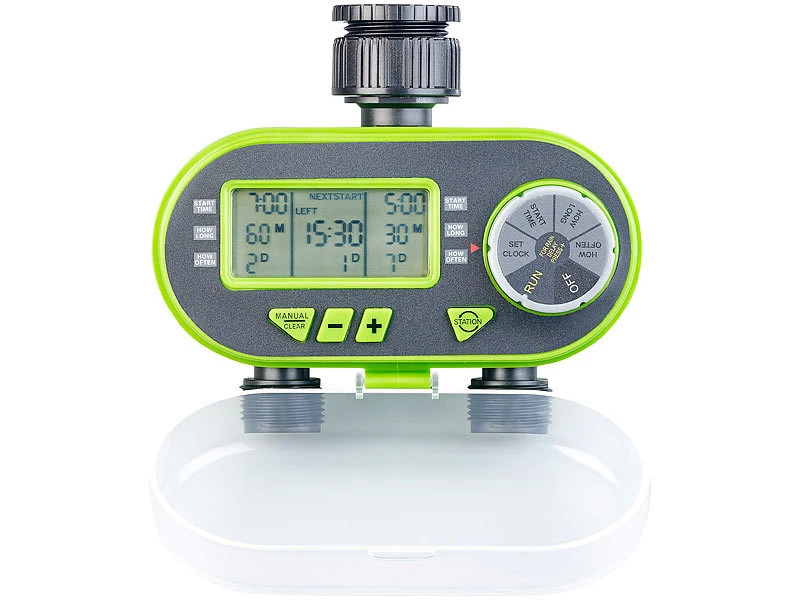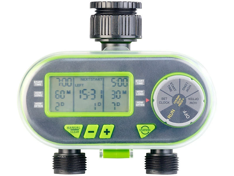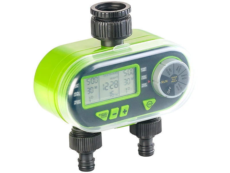 Sie schließen den Bewässerungscomputer direkt an den Wasserhahn an. Dank der 2 Anschlüsse für Gartenschläuche bewässern Sie sogar 2 Stellen in Ihrem Garten unabhängig voneinander – mit individuell einstellbaren Zeiten und Intervallen. Besonders praktisch ist der Bewässerungscomputer in der Urlaubszeit: So bleibt der Rasen auch in Ihrer Abwesenheit saftig grün!