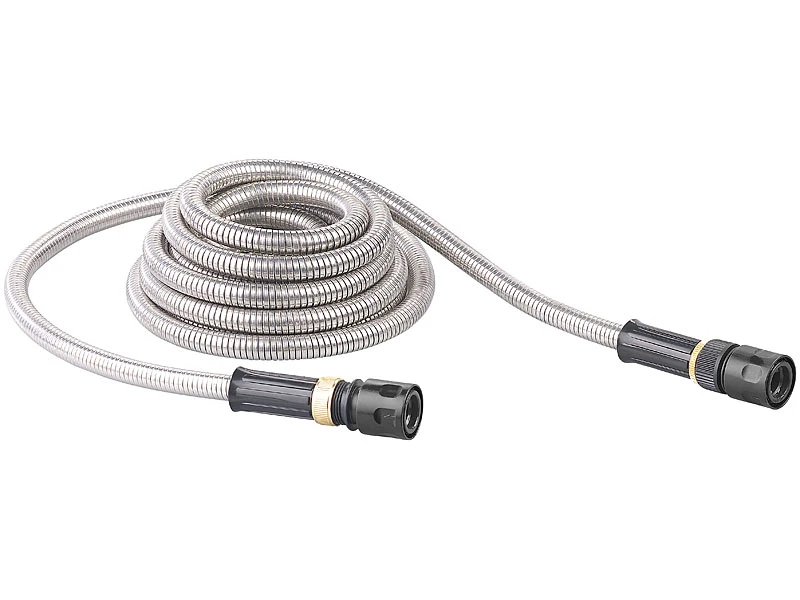 - Edelstahl-Gartenschlauch inklusive Brause und Aluminium-Adapter für 3/4″-Wasserhahn – Metallschlauch – Außerdem relevant oder passend zu: Profi, Blume, Blumen, flexibel, Terrasse, Reinigung, Flexibler, Bewässerung, Wasserschlauch dehnbar