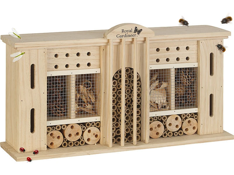 Geben Sie fleißigen Helfern ein großzügiges Quartier: Die unterschiedlich gestalteten Naturhölzer dienen Kleintieren als schützende Nist- und Überwinterungshilfe. Zudem bietet das geräumige Hotel winzigen Insekten und Nützlingen eine willkommene Zuflucht bei Wind und Wetter – ideal für Ihren Garten, Balkon und Terrasse!