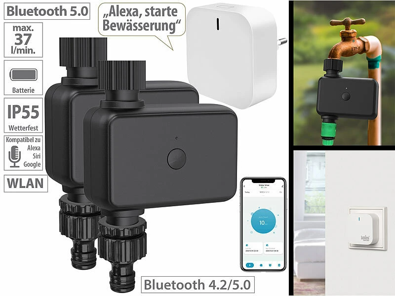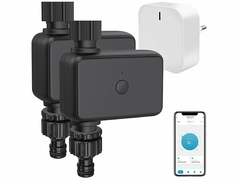 Royal Gardineer Smarthome-Zentrale:2er-Set Bewässerungscomputer Mit WLAN-Gateway & App-Steuerung
