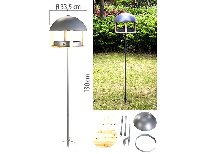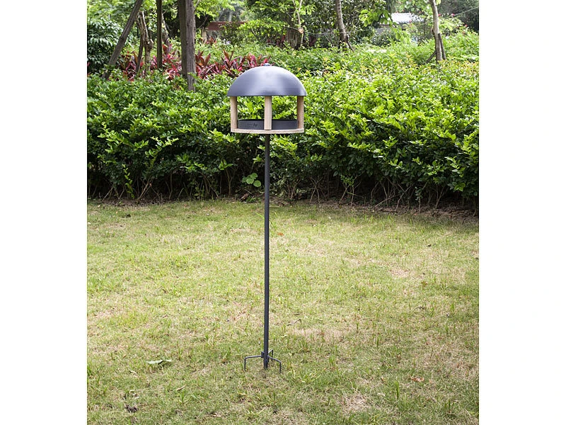 - Schutzdach aus Metall: Futter und Holzteile bleiben sauber und trocken