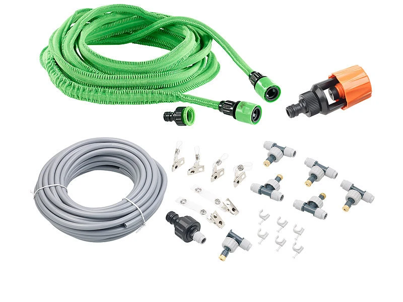 - Zerstäuber-Set inklusive Zerstäuber-Schlauch, 6 Zerstäuberdüsen, Befestigungs-Material, Gartenschlauch-Steckanschluss, Latex-Gartenschlauch, 3/4”-Wasserhahn-Adapter, Universal-Wasserhahn-Adapter und deutscher Anleitung