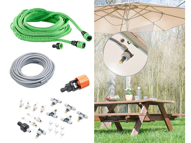 Verwandeln Sie Ihr Zuhause in eine sprudelnde Oase: Egal ob das Wasser unter Ihrem Sonnenschirm, an Ihrem Balkon-Geländer oder auf Ihrer Terrasse sprüht. Die Umgebungs-Temperatur sinkt durch Verdunstungskühle um gefühlte 9 °C. Damit lässt es sich auch in der schwülen Mittags-Sonne gut aushalten!