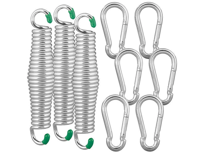 - 3er-Set Schwingfedern inklusive 6 Karabinern – Spiralfeder-Zugfeder – Außerdem relevant oder passend zu: Haken, Kinder, Schaukel, Karabinerhaken