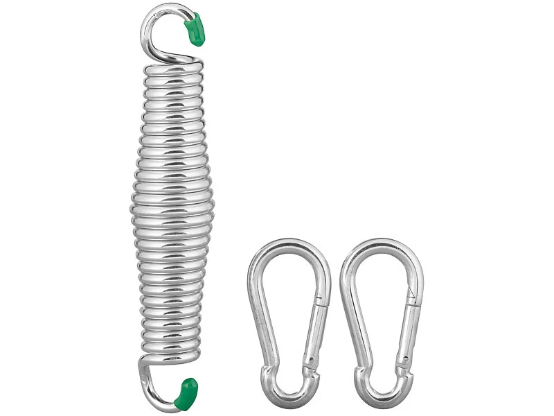 Sicher und hoch belastbar: Mit den robusten Karabinerhaken verbinden Sie die Feder z.B. mit einem Deckenhaken und Ihrem Hängesessel oder Ihrer Hängematte. Megastark: Jeder Karabiner trägt dabei ein Gewicht von bis zu 200 kg. Die Schwingfeder widersteht einer Belastung von bis zu 120 kg – genug z.B. für zwei Kinder.